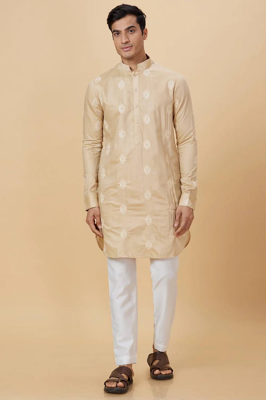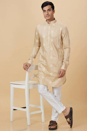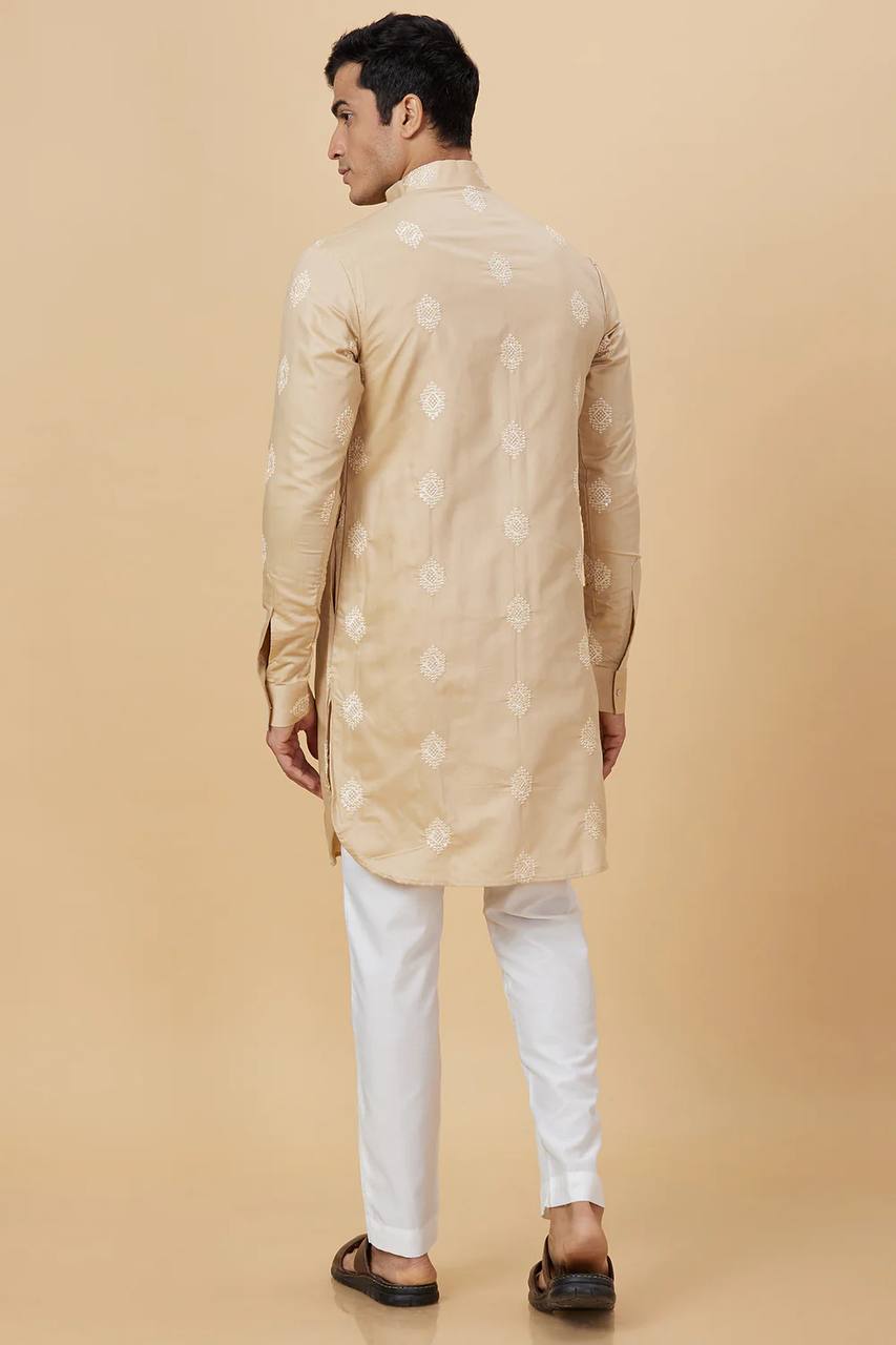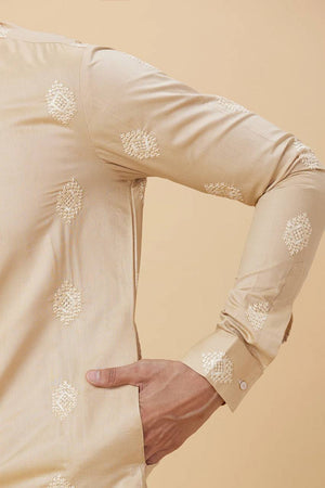 This Beige Motif Embroidered Work Men's Kurta with Pajama Is Created by Riwaaz Kurta,This Hand-stitched Kurta Is Made of 100% Pure Cotton Fabric With Having embroidered work Over It. Our Attractive embroidery Add More Charm to Your Look, Wear This at Any Time Because the Fabric Is So Smooth to Skin That You Will Love It.