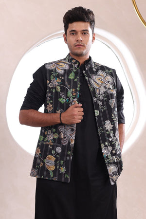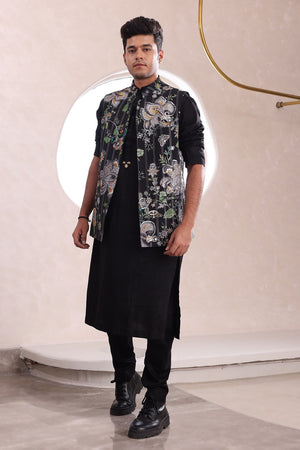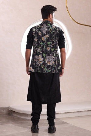 Black sleeveless jacket with all over embellished print Paired with a plain kurta & pant.