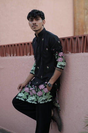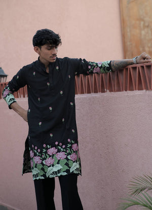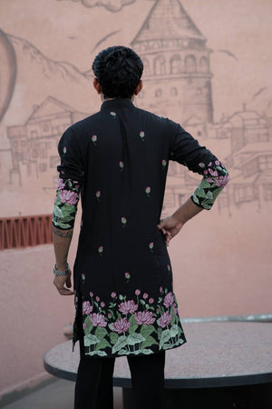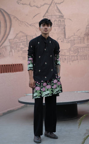 This BLACK PINK LOTUS HEAVY FLORAL Embroidered Men's Kurta with Pajama Is Created by Riwaaz Kurta ,This Hand-stitched Kurta Is Made of 100% Fendy Cotton Fabric With Having embroidered work Over It. Our Attractive embroidery Add More Charm to Your Look, Wear This at Any Time Because the Fabric Is So Smooth to Skin That You Will Love It.