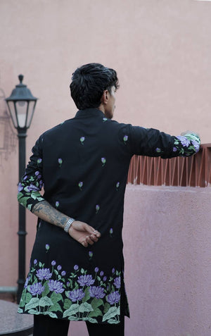 BLACK PURPLE LOTUS HEAVY FLORAL EMBROIDERED KURTA WITH PAJAMA