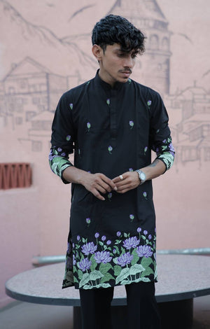 This BLACK PURPLE LOTUS HEAVY FLORAL Embroidered Men's Kurta with Pajama Is Created by Riwaaz Kurta ,This Hand-stitched Kurta Is Made of 100% Fendy Cotton Fabric With Having embroidered work Over It. Our Attractive embroidery Add More Charm to Your Look, Wear This at Any Time Because the Fabric Is So Smooth to Skin That You Will Love It.
