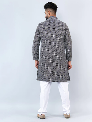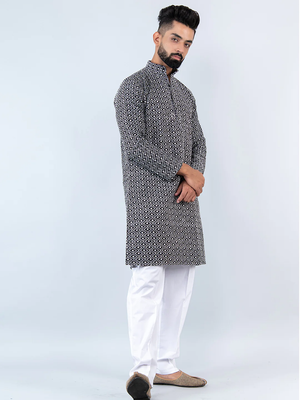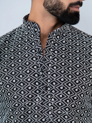 This Black Schiffli Embroidered Work Men's Kurta with Pajama Is Created by Riwaaz Kurta,This Hand-stitched Kurta Is Made of 100% Pure Cotton Fabric With Having embroidered work Over It. Our Attractive embroidery Add More Charm to Your Look, Wear This at Any Time Because the Fabric Is So Smooth to Skin That You Will Love It.