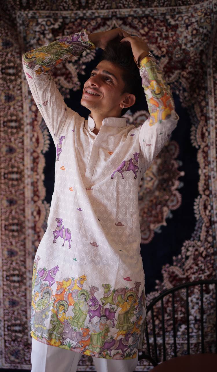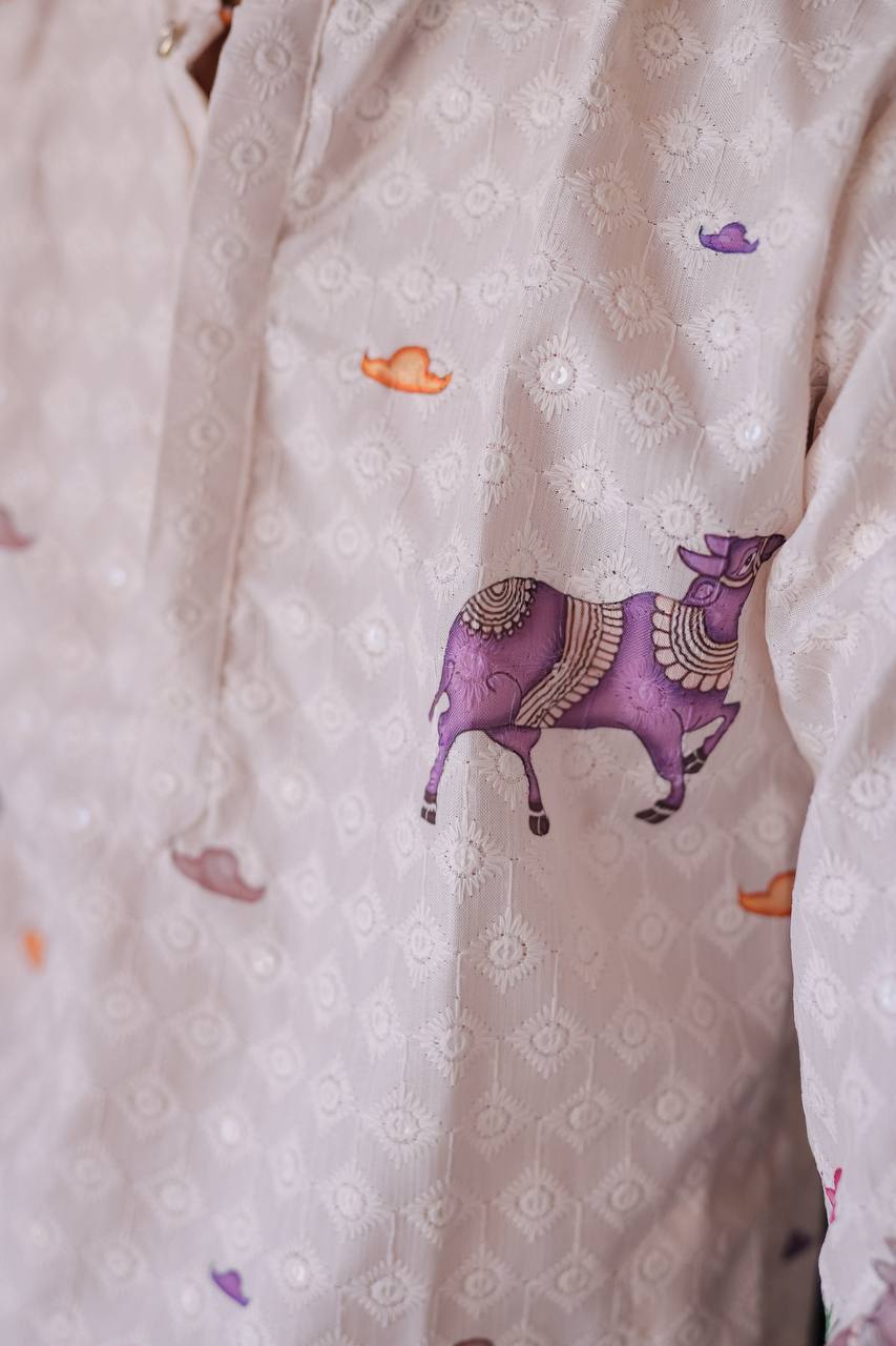 CREAM SCHIFFLI COW MOTIF PRINTRD KURTA WITH PAJAMA