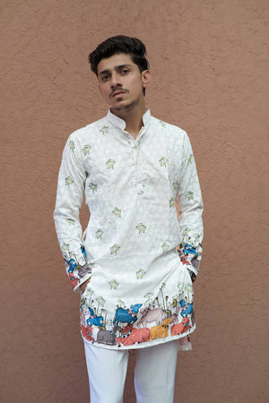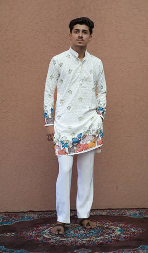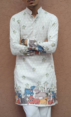 This Cream Schiffli MULTI COW Printed Kurta With Pajama Is Created by Riwaaz Kurta, This full stitched Kurta Is Made of Rayon Schiffli Fabric With Having digital Printed Prints Over It. Our Attractive Prints Add More Charm to Your Look, Wear This at Any Time Because the Fabric Is So Smooth to Skin That You Will Love It.