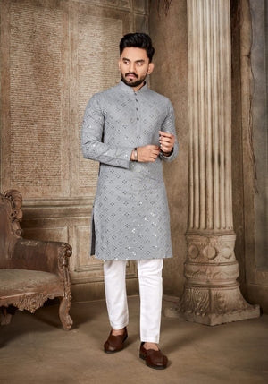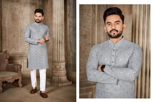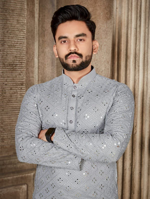 Gray Mirror Embroidered Work Men's Kurta with Pajama