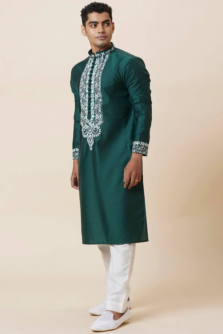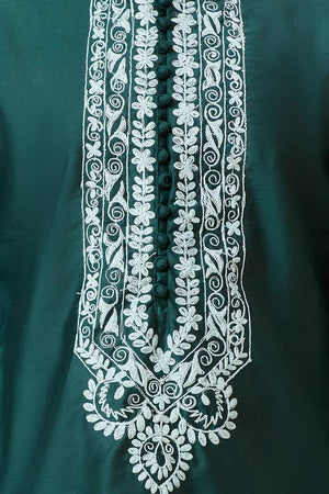 This Green Neck Embroidered Work Men's Kurta with Pajama Is Created by Riwaaz Kurta,This Hand-stitched Kurta Is Made of 100% Pure Cotton Fabric With Having embroidered work Over It. Our Attractive embroidery Add More Charm to Your Look, Wear This at Any Time Because the Fabric Is So Smooth to Skin That You Will Love It.
