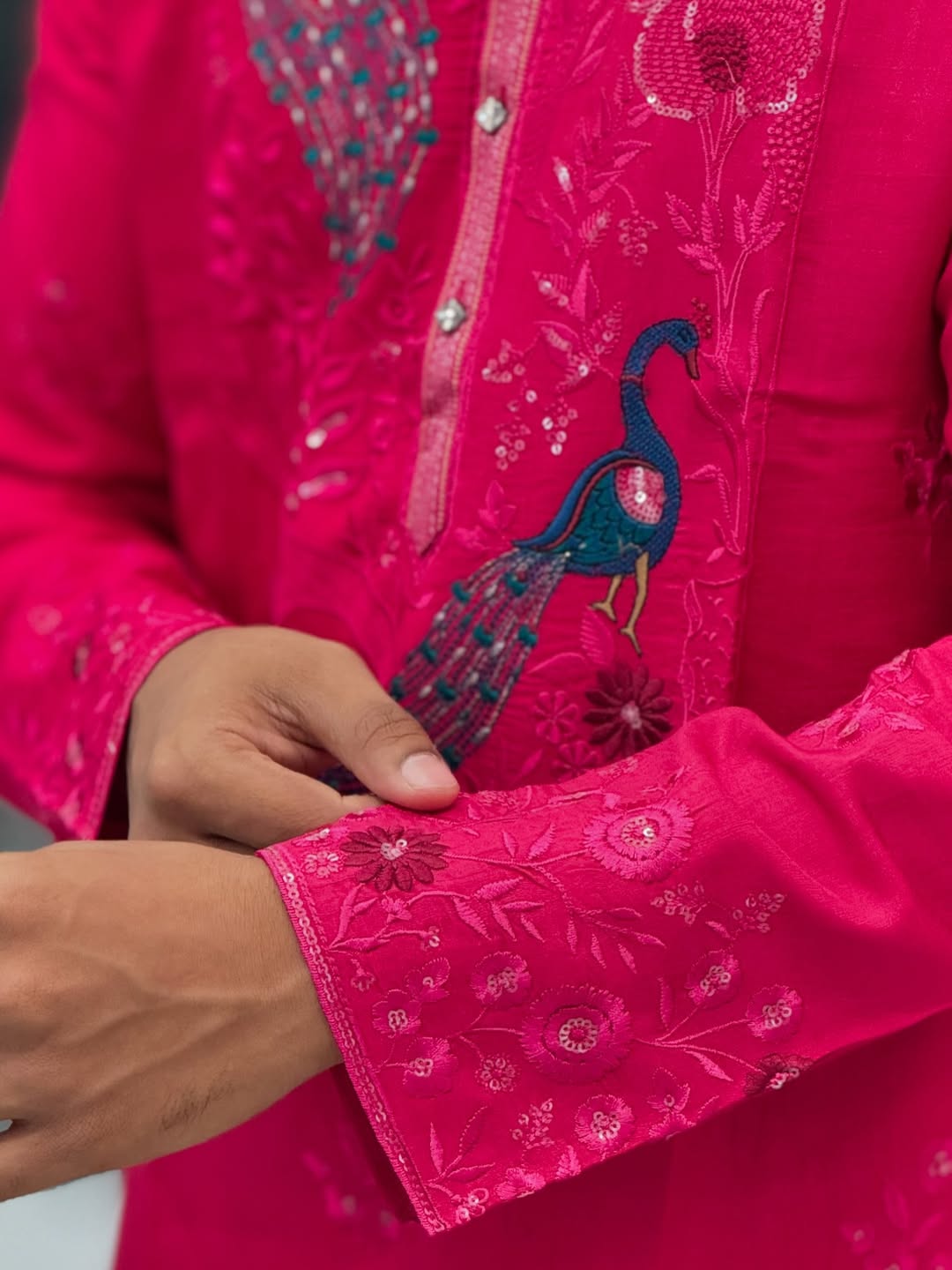 This Hot Pink Peacock Neck Embroidered Work Men's Kurta with Pajama Is Created by RIWAAZ KURTA, This Hand-stitched Kurta Is Made of 100% Roman Cotton (100% Cotton) Quality Fabric With Having embroidered work Over It. Our Attractive embroidery Add More Charm to Your Look, Wear This at Any Time Because the Fabric Is So Smooth to Skin That You Will Love It.