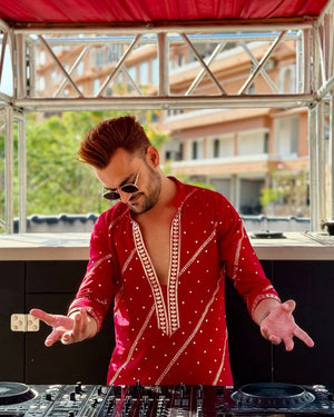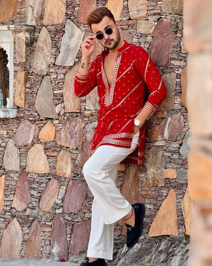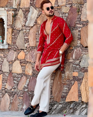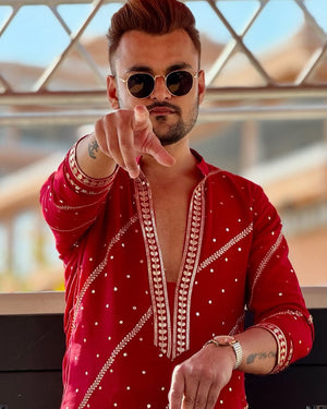 HOT RED OPEN V NECK EMBROIDERED WORK KURTA PAJAMA SET FOR MEN'S