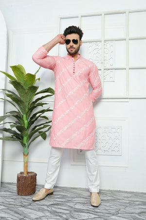 This Light Pink Embroidered Work Men's Kurta with Pajama Is Created by Riwaaz Kurta,This Hand-stitched Kurta Is Made of 100% Pure Cotton Fabric With Having embroidered work Over It. Our Attractive embroidery Add More Charm to Your Look, Wear This at Any Time Because the Fabric Is So Smooth to Skin That You Will Love It.