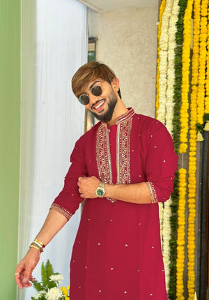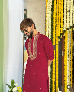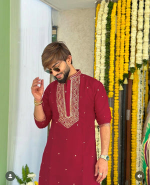 MARRON NECK SEQUENCE EMBROIDERED WORK KURTA PAJAMA SET FOR MEN'S