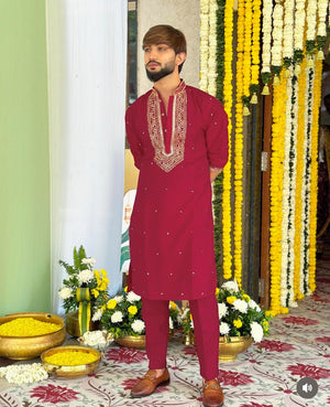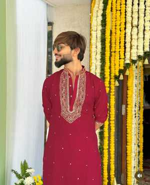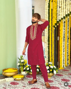 This MARRON NECK EMBROIDERED WORK KURTA AND PAJAMA Created by RIWAAZ KURTA ,This Hand-stitched Kurta Is Made of 100% Pure Rayon Cotton Fabric With Having embroidery heavy work Over It. Our Attractive Prints Add More Charm to Your Look, Wear This at Any Time Because the Fabric Is So Smooth to Skin That You Will Love It.