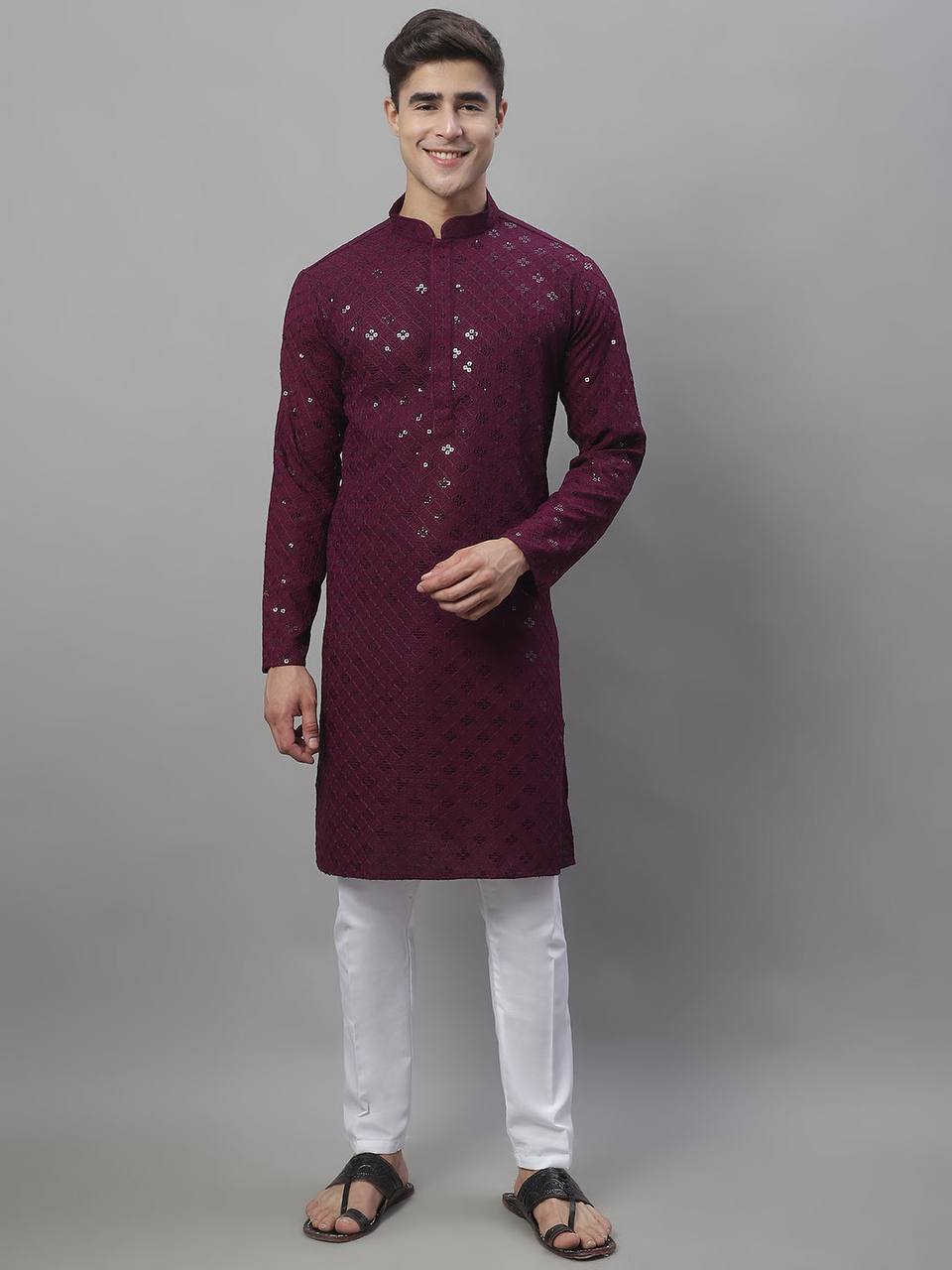 This Wine Schiffli Embroidered Work Men's Kurta with Pajama Is Created by Riwaaz Kurta,This Hand-stitched Kurta Is Made of 100% Pure Cotton Fabric With Having embroidered work Over It. Our Attractive embroidery Add More Charm to Your Look, Wear This at Any Time Because the Fabric Is So Smooth to Skin That You Will Love It.