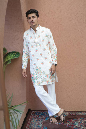 This OFF WHITE BIREDS SCHIFFLI DAMAN PRINTRD KURTA WITH PAJAMA Is Created by Riwaaz Kurta, This full stitched Kurta Is Made of Rayon Schiffli Fabric With Having digital Printed Prints Over It. Our Attractive Prints Add More Charm to Your Look, Wear This at Any Time Because the Fabric Is So Smooth to Skin That You Will Love It.