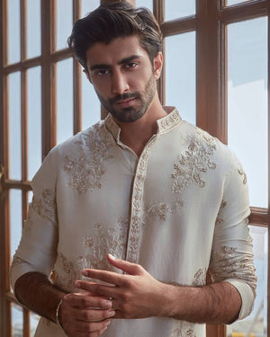 OFF WHITE BUTTA EMBROIDERED WORK KURTA PAJAMA SET