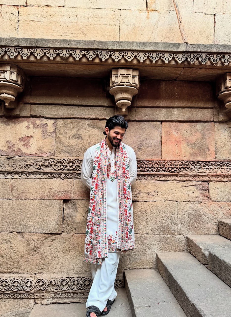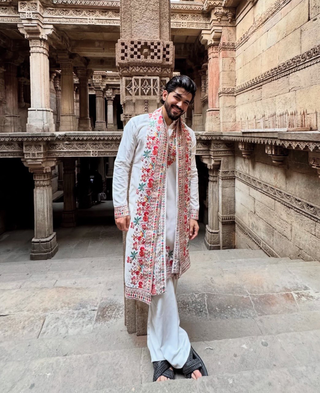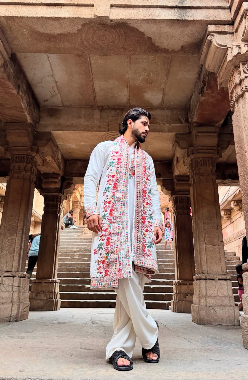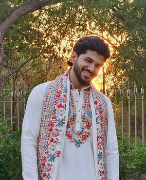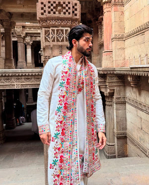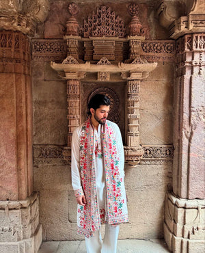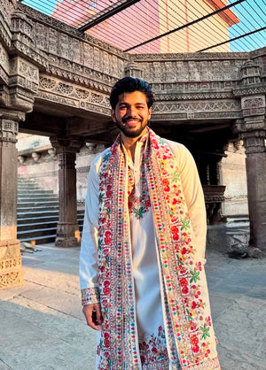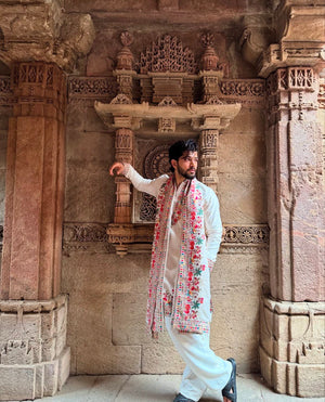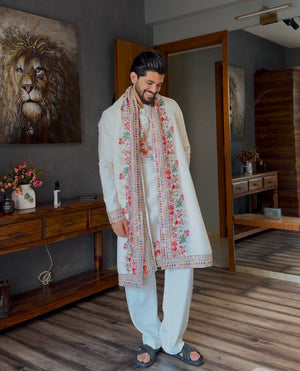 OFF WHITE HEAVY EMBROIDERED WORK KURTA PAJAMA AND DUPATTA SET FOR MEN'S