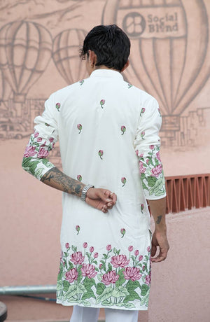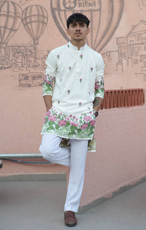 This OFF WHITE PINK LOTUS HEAVY FLORAL Embroidered Men's Kurta with Pajama Is Created by Riwaaz Kurta ,This Hand-stitched Kurta Is Made of 100% Fendy Cotton Fabric With Having embroidered work Over It. Our Attractive embroidery Add More Charm to Your Look, Wear This at Any Time Because the Fabric Is So Smooth to Skin That You Will Love It.