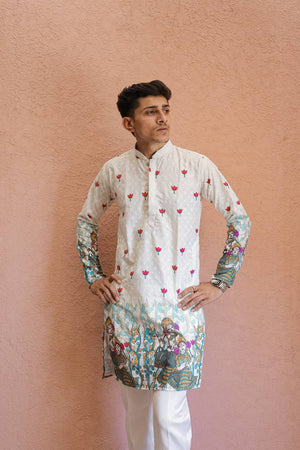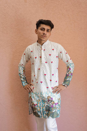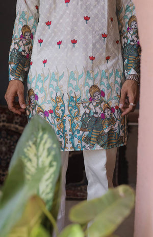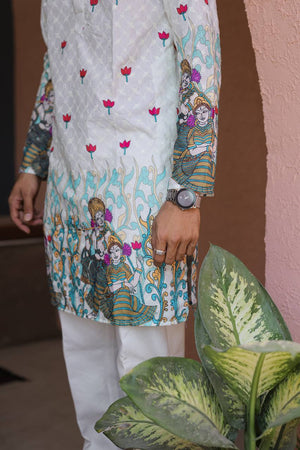 OFF WHITH SCHIFFLI RADHA KRISHNA PRINTRD KURTA WITH PAJAMA