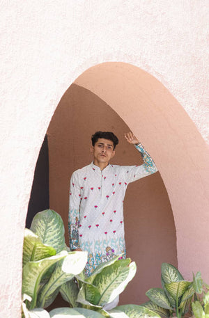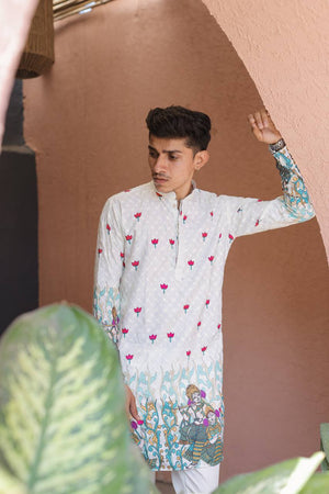 This Off White Schiffli Embroidered Radha Krishna Printed Kurta With Pajama Is Created by Riwaaz Kurta, This full stitched Kurta Is Made of Rayon Fabric With Having Hand digital Printed Prints Over It. Our Attractive Prints Add More Charm to Your Look, Wear This at Any Time Because the Fabric Is So Smooth to Skin That You Will Love It.