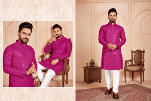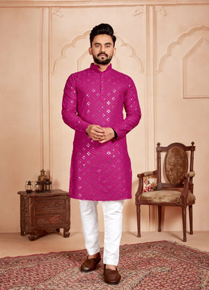 This Pink Mirror Embroidered Work Men's Kurta with Pajama Is Created by MEN IN MADE ,This Hand-stitched Kurta Is Made of 100% Pure Cotton Fabric With Having embroidered work Over It. Our Attractive embroidery Add More Charm to Your Look, Wear This at Any Time Because the Fabric Is So Smooth to Skin That You Will Love It.