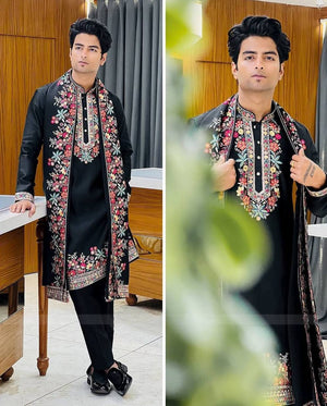 Upgrade your festive look with our elegant Regal BLACK Silk Kurta Set. Made with premium Krazy silk, this ensemble showcases intricate multicolored embroidery and zari work for a touch of tradition with a modern twist. Designed with a mandarin collar, full sleeves, and knee-length silhouette - it offers both style and comfort. Complete with straight pants and a matching dupatta, it's the ideal choice for any festive occasion.