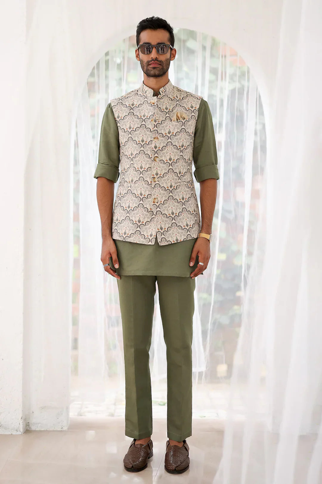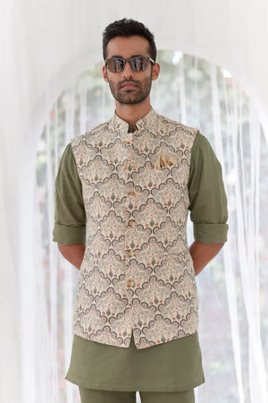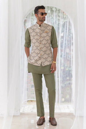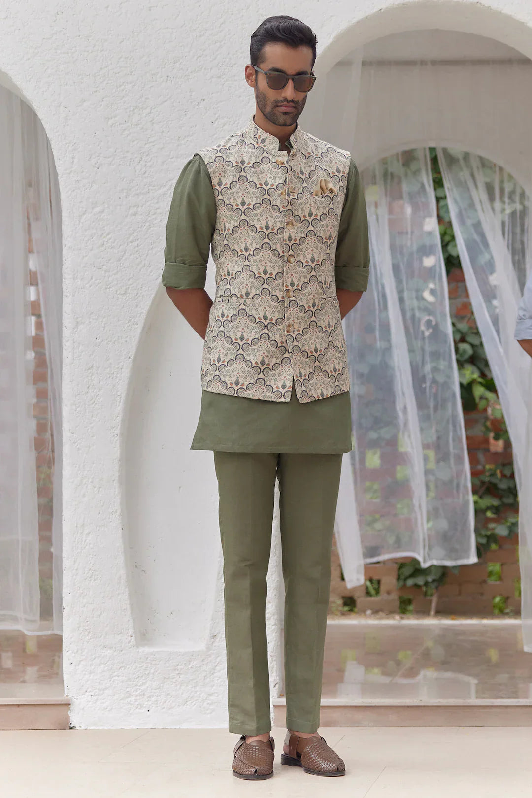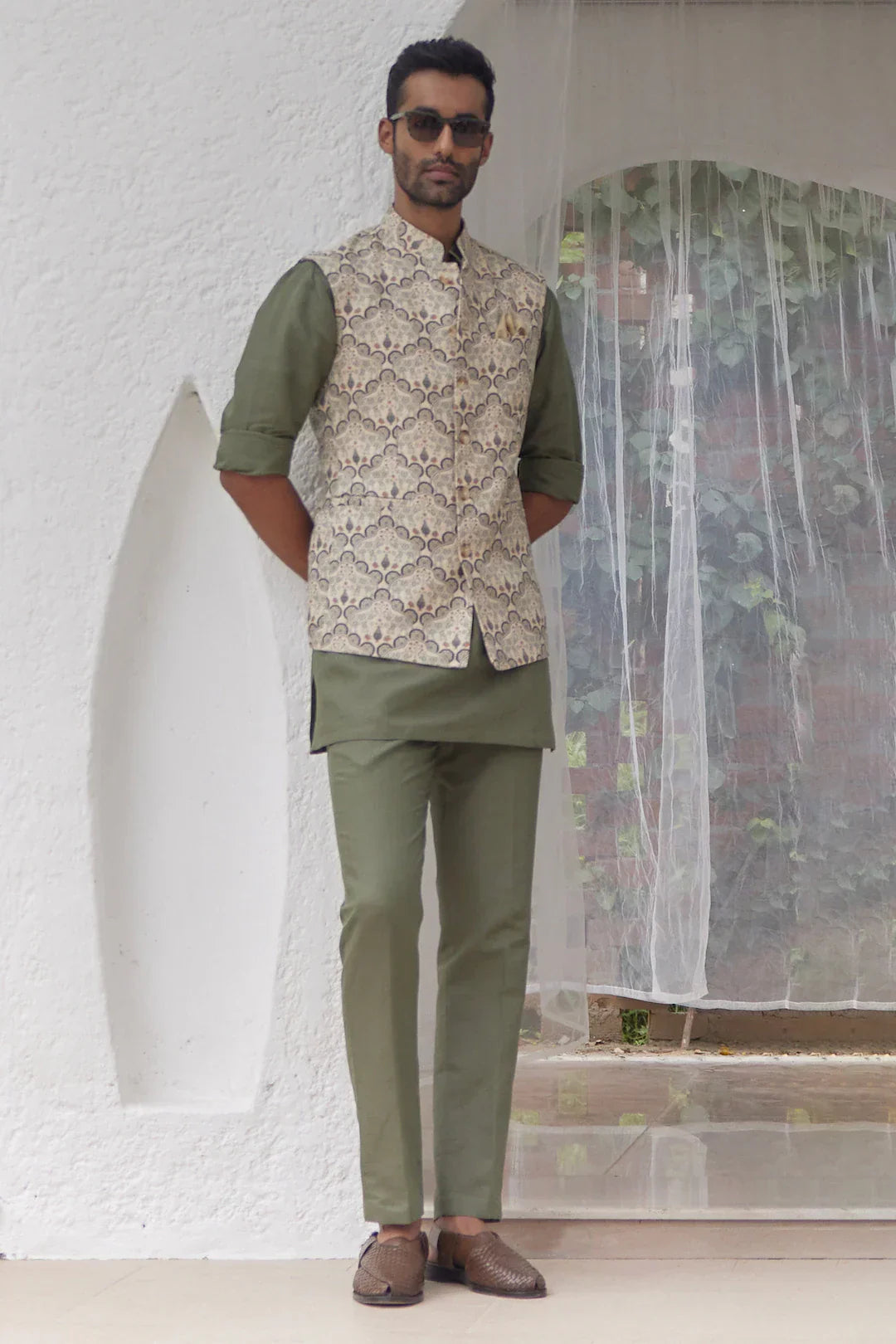Immerse yourself in the timeless charm of our Sage Green Paisley Printed Jacket Set. This set features an all-over frontal paisley printed Jacket , complemented by a sage green kurta. Redefine your style effortlessly with this elegant and paisley-inspired ensemble, perfect for adding a touch of classic sophistication to your wardrobe.