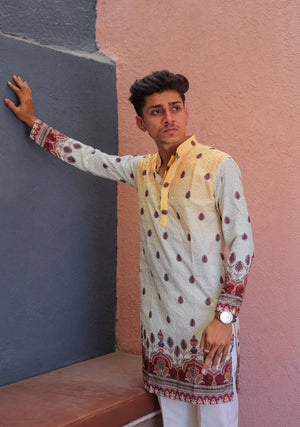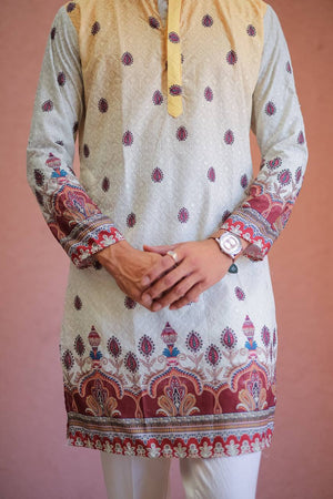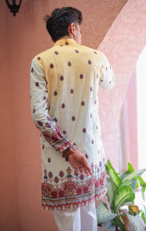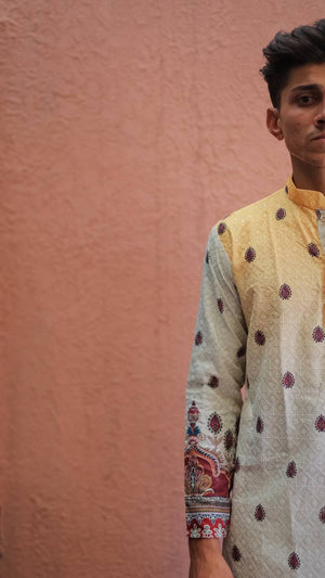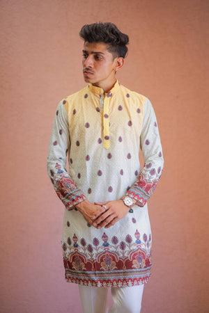 This Shaded Yellow Schiffli Daman Motif Printed Kurta With Pajama Is Created by Riwaaz Kurta, This full stitched Kurta Is Made of Rayon Schiffli Fabric With Having digital Printed Prints Over It. Our Attractive Prints Add More Charm to Your Look, Wear This at Any Time Because the Fabric Is So Smooth to Skin That You Will Love It.