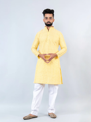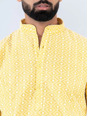 This Light Yellow Schiffli Embroidered Work Men's Kurta with Pajama Is Created by Riwaaz Kurta,This Hand-stitched Kurta Is Made of 100% Pure Cotton Fabric With Having embroidered work Over It. Our Attractive embroidery Add More Charm to Your Look, Wear This at Any Time Because the Fabric Is So Smooth to Skin That You Will Love It.