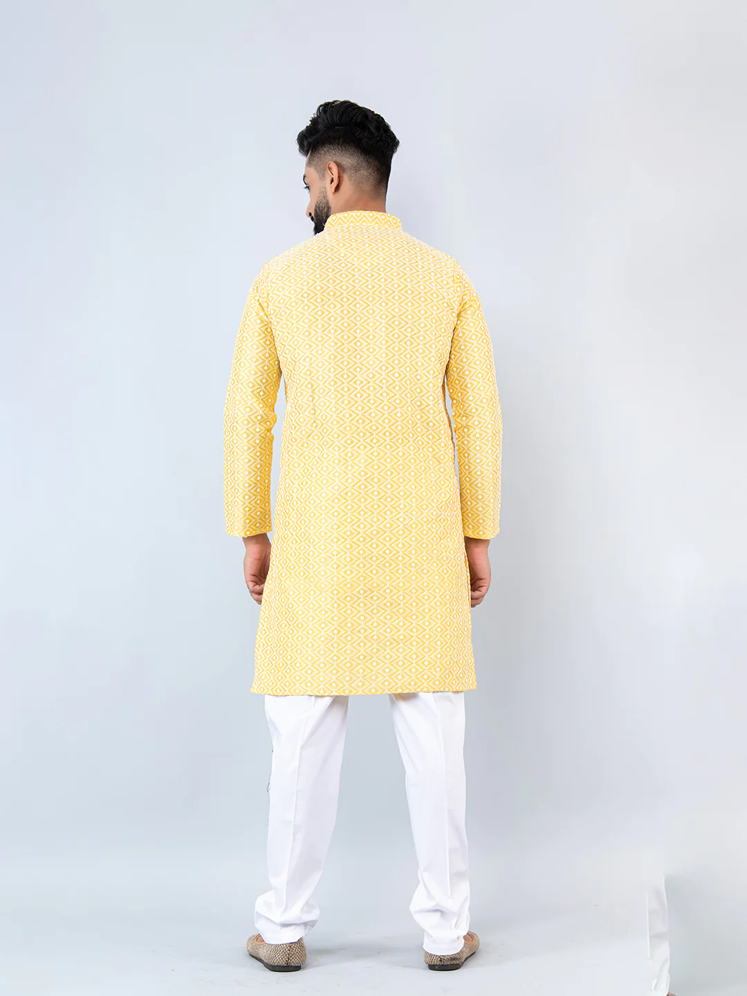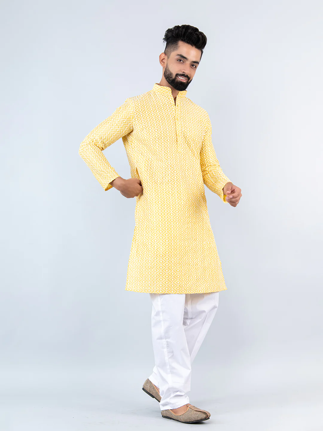 The Light Yellow Schiffli Embroidered Work Men's Kurta with Pajama