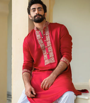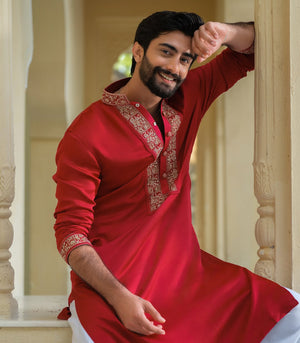 TRENDY RED NECK EMBROIDERY KURTA PAJAMA SET