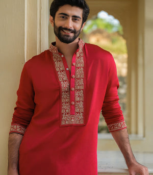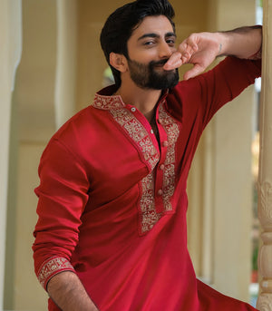 This Trendy Red Neck Golden Embroidered Work Men's Kurta with Pajama Is Created by RIWAAZ KURTA, This Hand-stitched Kurta Is Made of 100% Rayon Cotton (100% Cotton) 22kg Quality Fabric With Having embroidered work Over It. Our Attractive embroidery Add More Charm to Your Look, Wear This at Any Time Because the Fabric Is So Smooth to Skin That You Will Love It.