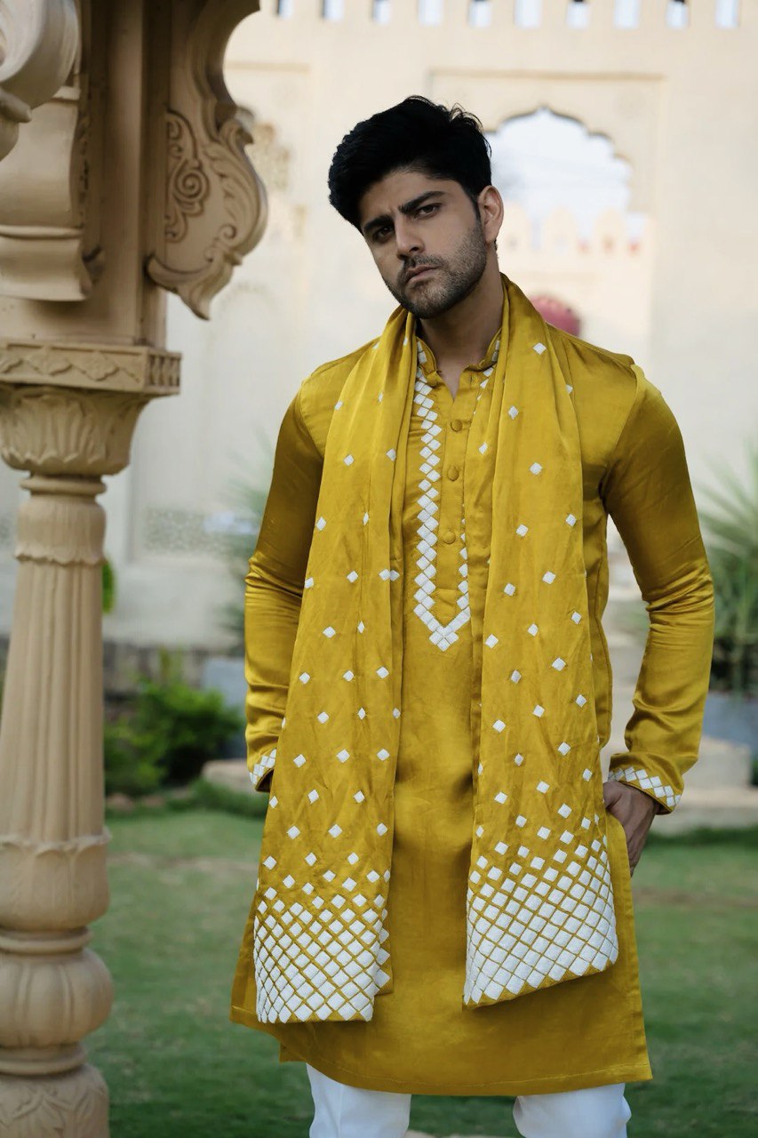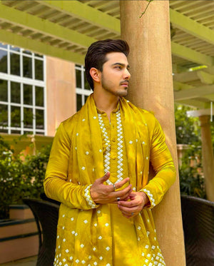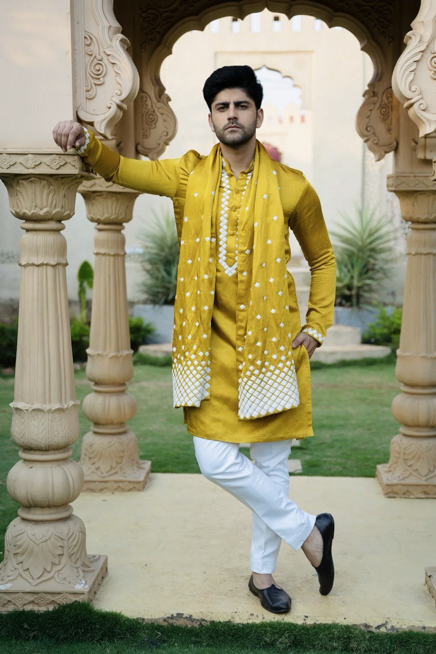 YELLOW MUSTARD EMBROIDERED WORK KURTA PAJAMA AND DUPATTA SET FOR MEN'S