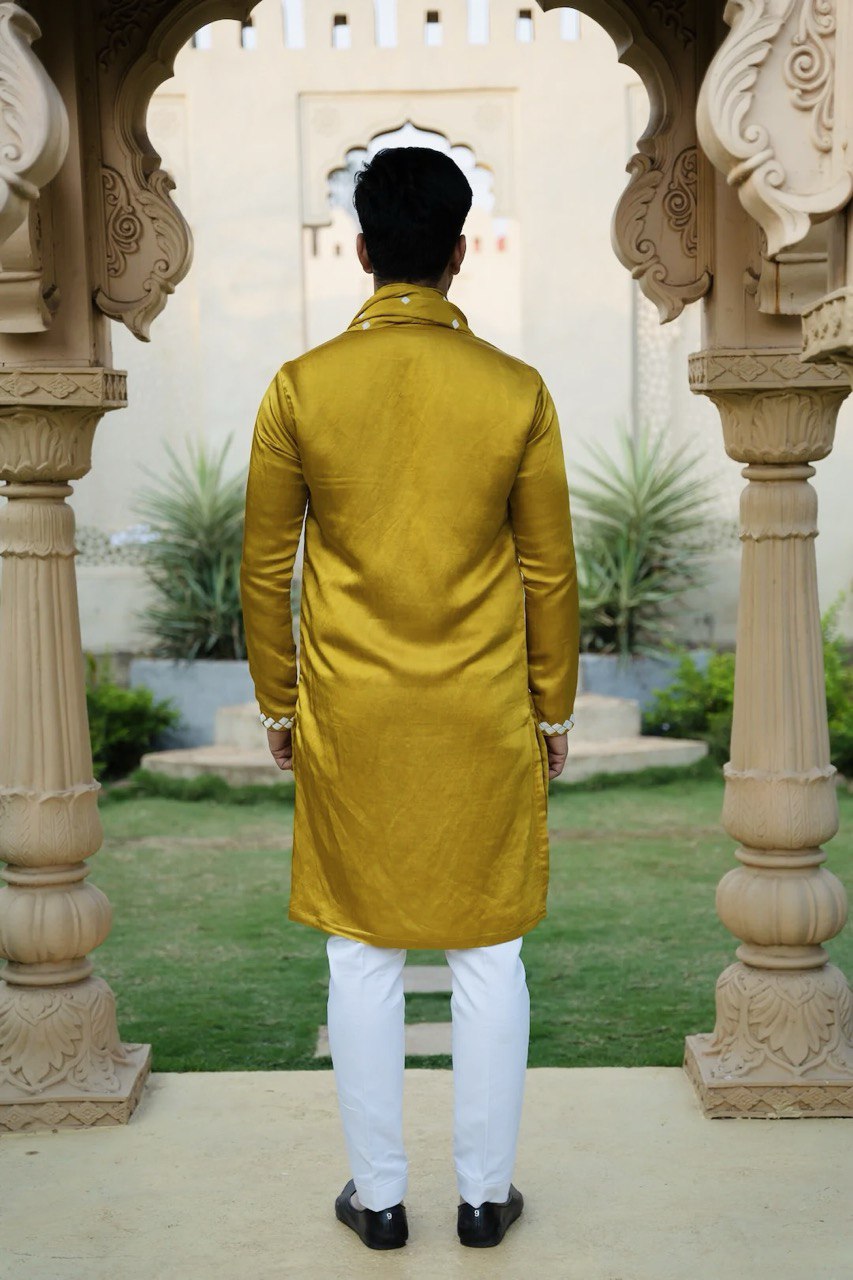 This YELLOW MUSTARD EMBROIDERED WORK KURTA AND PAJAMA Created by RIWAAZ KURTA ,This Hand-stitched Kurta Is Made of 100% Pure Rayon Cotton Fabric With Having embroidery heavy work Over It. Our Attractive Prints Add More Charm to Your Look, Wear This at Any Time Because the Fabric Is So Smooth to Skin That You Will Love It.