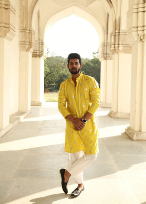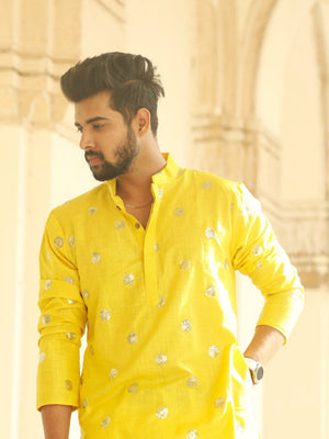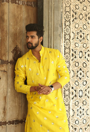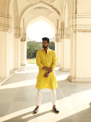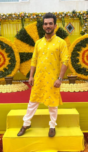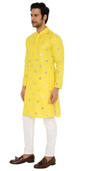 This Yellow Sequence Embroidered Work Men's Kurta with Pajama Is Created by Riwaaz Kurta,This Hand-stitched Kurta Is Made of 100% Pure Cotton Fabric With Having embroidered work Over It. Our Attractive embroidery Add More Charm to Your Look, Wear This at Any Time Because the Fabric Is So Smooth to Skin That You Will Love It.